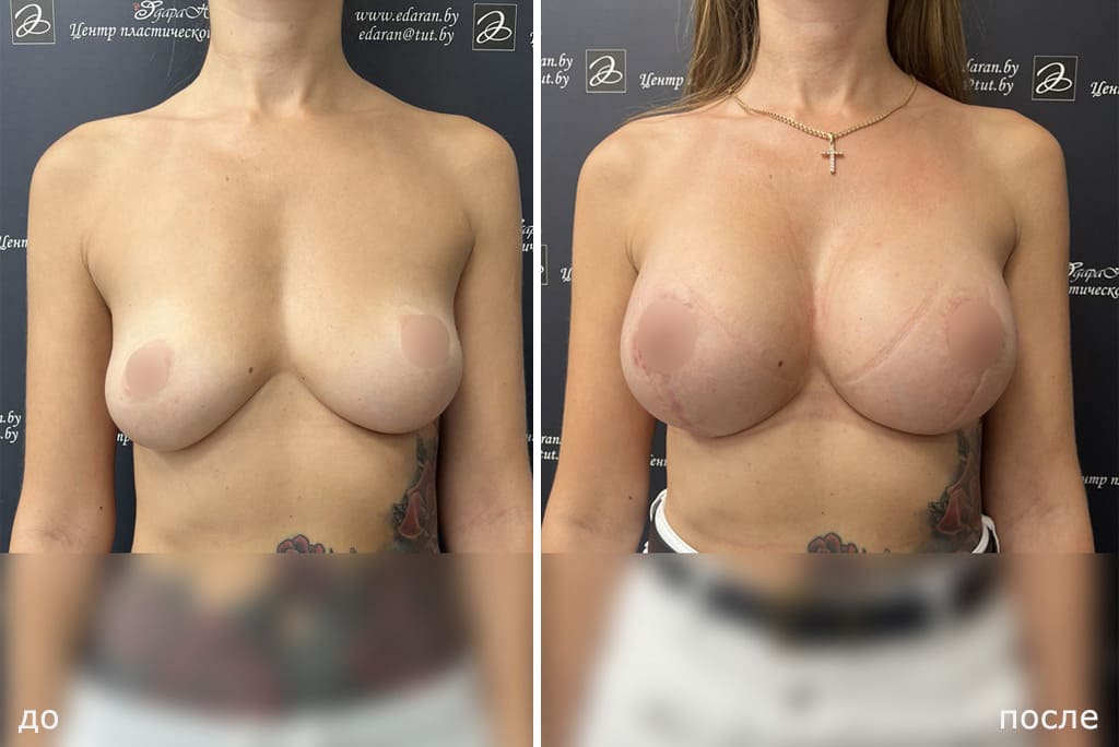 - В том случае, если диагностируется ассиметричный птоз обеих молочных желёз, однако одна грудь превышает другую по размеру, используется методика подтяжки молочных желёз с обеих сторон. При этом, если размер груди не превышает С, то увеличивают одну грудь, либо же обе, но с использованием имплантатов разного размера.